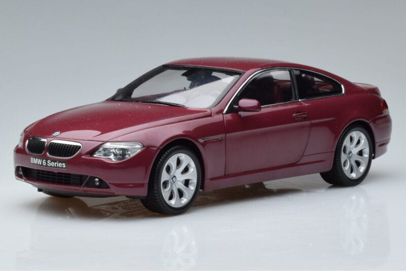 The BMW 645Ci E63 Tummanpunainen Kyosho 1:18 is crafted from Metalli. Die-cast zinc alloy body with detailed plastic parts, rubber tires, and high-quality paint finish. Die-cast models are known for their weight, durability, and realistic feel.