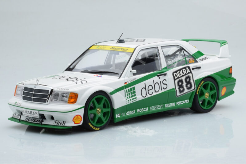 The Mercedes 190E 2.5-16 W201 EVO 2 Debis #88 B. Schneider Team Zackspeed DTM 1991 Minichamps 1:18 is crafted from Metalli. Die-cast zinc alloy body with detailed plastic parts, rubber tires, and high-quality paint finish. Die-cast models are known for their weight, durability, and realistic feel.