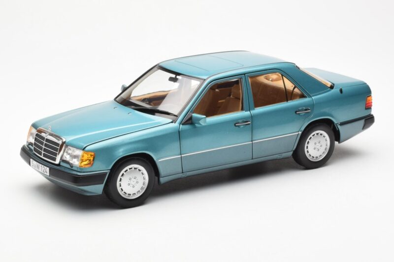The Mercedes 230E W124 Beryl Metallic Jälleenmyyjäversio Norev 1:18 is crafted from Metalli. Die-cast zinc alloy body with detailed plastic parts, rubber tires, and high-quality paint finish. Die-cast models are known for their weight, durability, and realistic feel.