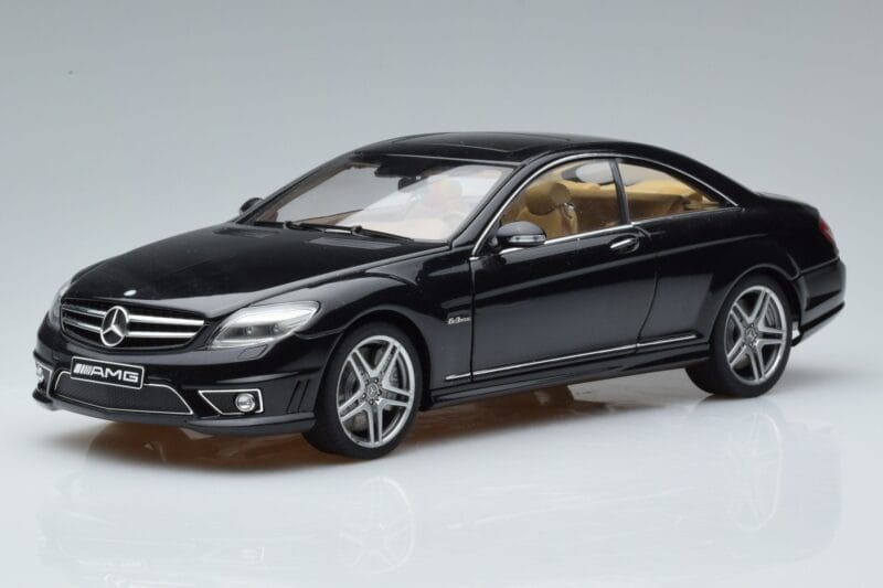 The Mercedes CL63 AMG C216 Musta AUTOart 1:18 is crafted from Metalli. Die-cast zinc alloy body with detailed plastic parts, rubber tires, and high-quality paint finish. Die-cast models are known for their weight, durability, and realistic feel.